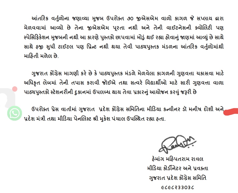 ગત તારીખ 24મી 2025 ના રોજ ગુજરાત પ્રદેશ કોંગ્રેસ સમિતિના પ્રવક્તા અને મીડિયા કોર્ડીનેટર શ્રી હેમાંગ રાવલે પત્રકાર પત્રકાર પરિષદને સંબોધતા ભાજપ સરકાર પર પાઠ્યપુસ્તક મંડળ માં ભ્રષ્ટાચાર હલકી ગુણવત્તાના કાગળો બાબતે કરોડોના ભ્રષ્ટાચારના કૌભાડ ઉજાગર કરતા જણાવ્યું હતું કે “૨૦૨૩-૨૪માં પાઠ્યપુસ્તક મંડળે પેપરના ૧૦૮ રૂપિયા કિલોના ભાવે ટેન્ડર નક્કી કરેલ હતું. તથા આ ટેન્ડર છેલ્લા ૧૫ વર્ષથી એકની એક જ એજન્સીને ફાળે જતું હતું વળી એ જ પ્રકારના કાગળ અન્ય એજન્સી ૮૭ રૂપિયા કિલો આપવા પણ તૈયાર હતી પરંતુ તે ૧૦૭ રૂપિયાના ભાવે ખરીદવામાં આવ્યા હતા. આ બાબત હાઈકોર્ટમાં પણ લઈ જવામાં આવી હતી તે સમગ્ર પ્રકરણને કોંગ્રેસ દ્વારા ઉજાગર કરવામા આવ્યું હતું અને તાજેતરના નવા ટેન્ડરમાં આ વર્ષે એટલે કે વર્ષ ૨૦૨૫માં જુન મહિનામાં જે પુસ્તકો વેચવામાં આવશે તેના માટેના કાગળ ખરીદીમાં પાઠ્ય પુસ્તક મંડળમાં મીલોનો ભાવ રૂા. ૫૩.૫૦ પ્રતિ કિ.ગ્રા. ૭૦ ગ્રામ વજનવાળી ગુણવત્તાનો પેપર ખરીદેલ છે.