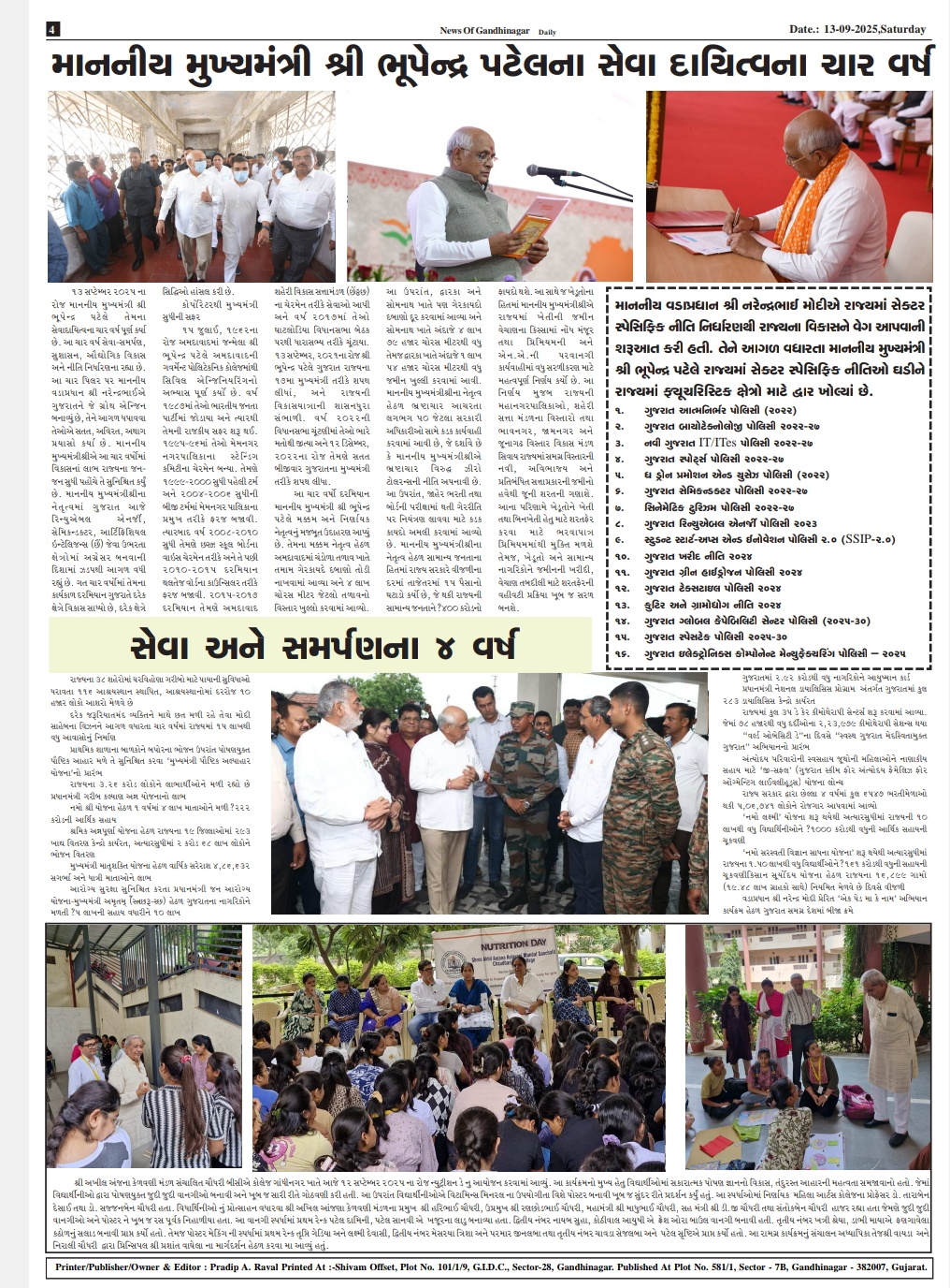 *ગાંધીનગર, 13 સપ્ટેમ્બર 2025:* મુખ્યમંત્રી શ્રી ભૂપેન્દ્ર પટેલે ગુજરાતના મુખ્યમંત્રી તરીકે કાર્યકાળ સંભાળ્યો એને આજે 13 સપ્ટેમ્બર, 2025ના રોજ 4 વર્ષ પૂર્ણ થઈ રહ્યા છે. સુશાસનના આ 4 વર્ષ દરમ્યાન મુખ્યમંત્રીશ્રીએ વડાપ્રધાન શ્રી નરેન્દ્ર મોદી દ્વારા શરૂ થયેલી ગુજરાતની વિકાસયાત્રાને સતત આગળ ધપાવી છે. તેમના મક્કમ નેતૃત્વ હેઠળ ગુજરાતે વિવિધ ક્ષેત્રોમાં પ્રગતિ કરી છે. આ દરમ્યાન મુખ્યમંત્રી શ્રી ભૂપેન્દ્ર પટેલ દ્વારા શરૂ થયેલી લોકકલ્યાણકારી યોજનાઓએ રાજ્યની પ્રજાનો સર્વાંગી વિકાસ સુનિશ્ચિત કર્યો છે. આવી જ એક યોજના છે- મુખ્યમંત્રી પૌષ્ટિક અલ્પાહાર યોજના, જે શિક્ષણ સાથે પોષણના સર્વગ્રાહી અભિગમ સાથે પ્રાથમિક શાળાઓના વિદ્યાર્થીઓ માટે શરૂ કરવામાં આવી હતી.