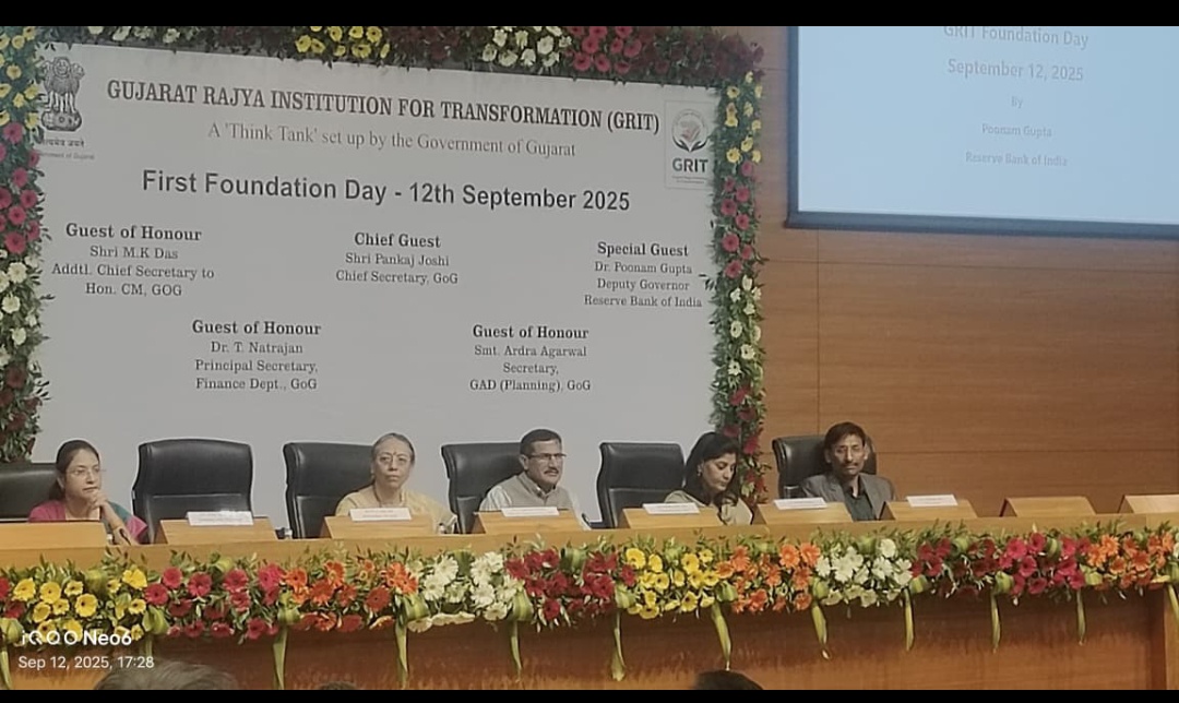12 સપ્ટેમ્બર 2025ના રોજ ગુજરાત રાજ્ય ઇન્સ્ટિટ્યુશન ફોર ટ્રાન્સફોર્મેશન (GRIT) એ પોતાનો પ્રથમ સ્થાપના દિવસ ઉજવ્યો, જે વિકાસિત ગુજરાતના વિઝન હેઠળ વિકાસની વ્યૂહરચનાઓને આગળ ધપાવતા રાજ્યના અગ્રણી થિંક-ટેંક તરીકેની એક વર્ષની સફરને દર્શાવે છે. આ અવસરે, GRIT દ્વારા જ્ઞાનવિનિમય અને આધુનિક વિષયો પર ચર્ચા માટે વ્યાખ્યાન શ્રેણી શરૂ કરવામાં આવી. શ્રેણીની શરૂઆત રિઝર્વ બેંક ઓફ ઇન્ડિયા (RBI) ની ડેપ્યુટી ગવર્નર ડૉ. પૂનમ ગુપ્તાના મુખ્ય ભાષણથી થઈ, જેમણે “ગ્લોબલ ઇકોનોમિક આઉટલુક” વિષય પર માર્ગદર્શનઆપ્યું.