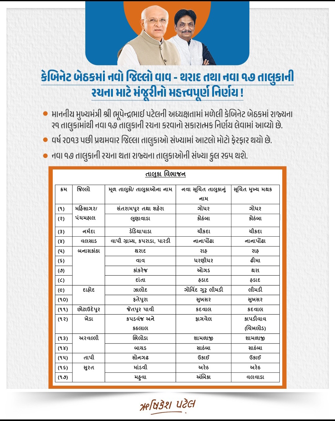 પ્રવક્તા મંત્રી શ્રી ઋષિકેશ પટેલે નવા તાલુકાઓની રચના અંગેની વિગતો આપતા કહ્યું હતું કે, વડાપ્રધાન શ્રી નરેન્દ્રભાઈ મોદીએ ગુજરાતના તત્કાલિન મુખ્યમંત્રી તરીકે તાલુકા એકમને વિકાસ અને વહિવટમાં વધુ સશક્ત બનાવવા ATVT એટલે કે, આપણો તાલુકો વાયબ્રન્ટ તાલુકાની વિભાવના આપી હતી. વર્ષ ૨૦૧૩માં નવા ૨૩ તાલુકાઓની તેમણે કરેલી રચના પછી પ્રથમવાર સૌથી વધુ સંખ્યામાં ૧૭ નવા તાલુકાઓની રચનાનો મુખ્યમંત્રી શ્રી ભૂપેન્દ્ર પટેલની સરકારે નિર્ણય કર્યો છે.